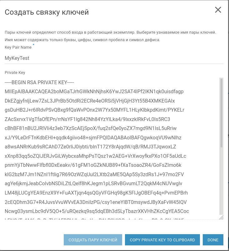 1.5. В результате мы получим окно с новым приватным ключом. Этот ключ обязательно нужно сохранить в текстовом формате себе на локальный компьютер после чего нажимаем кнопку «DONE».