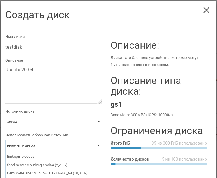 1.1. Создаем диск и в качестве источника для него используем образ с приставкой cloudimg/openstack/GenericCloud в названии.