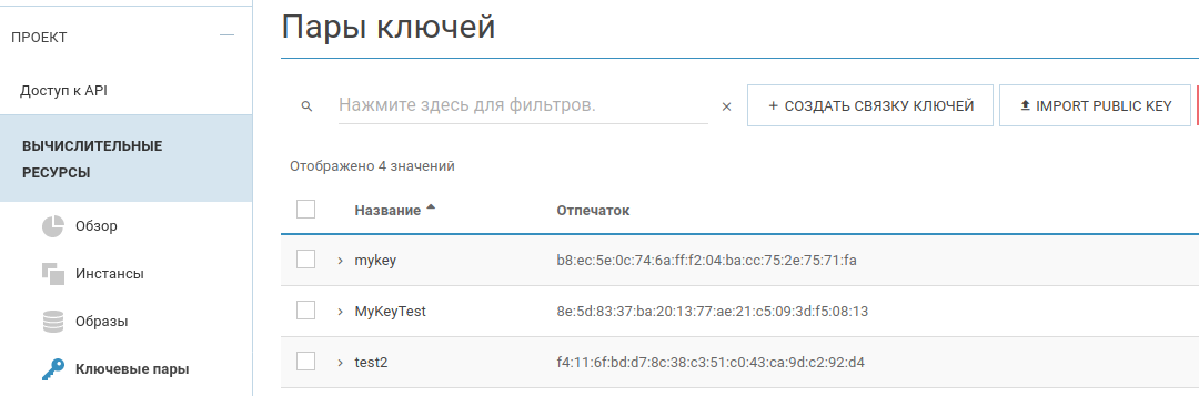 2.2. В панели управления «SIM-Cloud» переходим в «Вычислительные ресурсы» - «Ключевые пары» и нажимаем «IMPORT PUBLIC KEY»