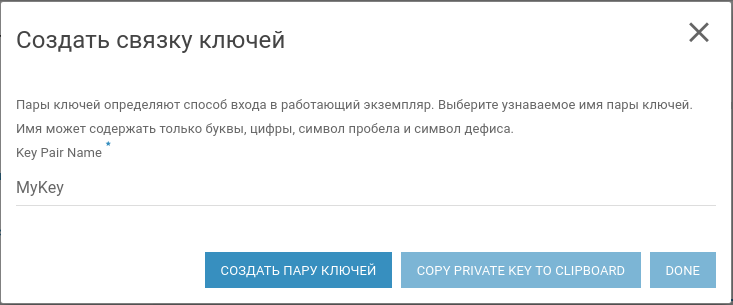 1.4. В поле «Key Pair Name» вводим желаемое имя нашей ключевой пары и нажимаем кнопку «СОЗДАТЬ ПАРУ КЛЮЧЕЙ».