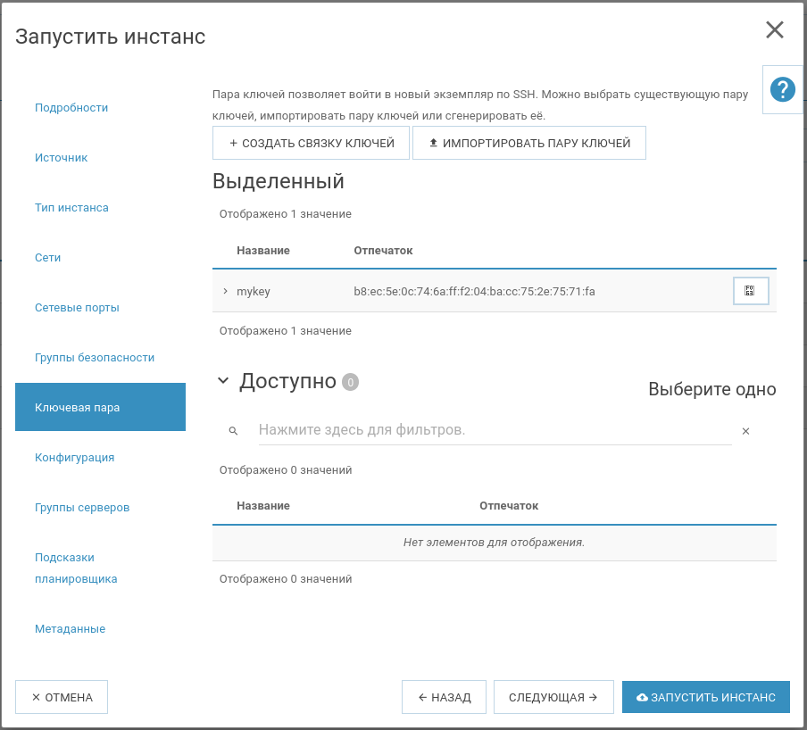2.6. В этом окне в разделе «Ключевая пара» выбираем наш импортированный ключ и нажимаем «Запустить инстанс». В результате наш публичный ключ автоматически будет импортирован в файл ~/.ssh/authorized_keys на нашем сервере.