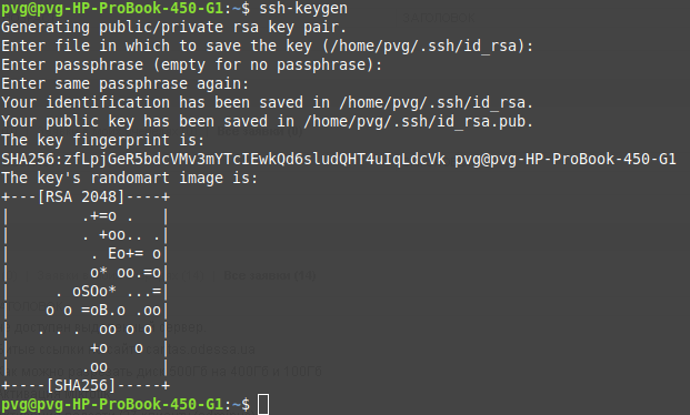2.1. На локальном компьютере в терминале необходимо выполнить команду «ssh-keygen», на все запросы просто нажимаем «Enter». Мы получим результат подобный тому, который видим на рисунке ниже.