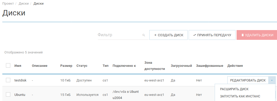 2.5. В панели управления дисками напротив нужного диска выбираем «ЗАПУСТИТЬ КАК ИНСТАНС», после чего откроется новое окно где нам необходимо заполнить поля с необходимыми параметрами
