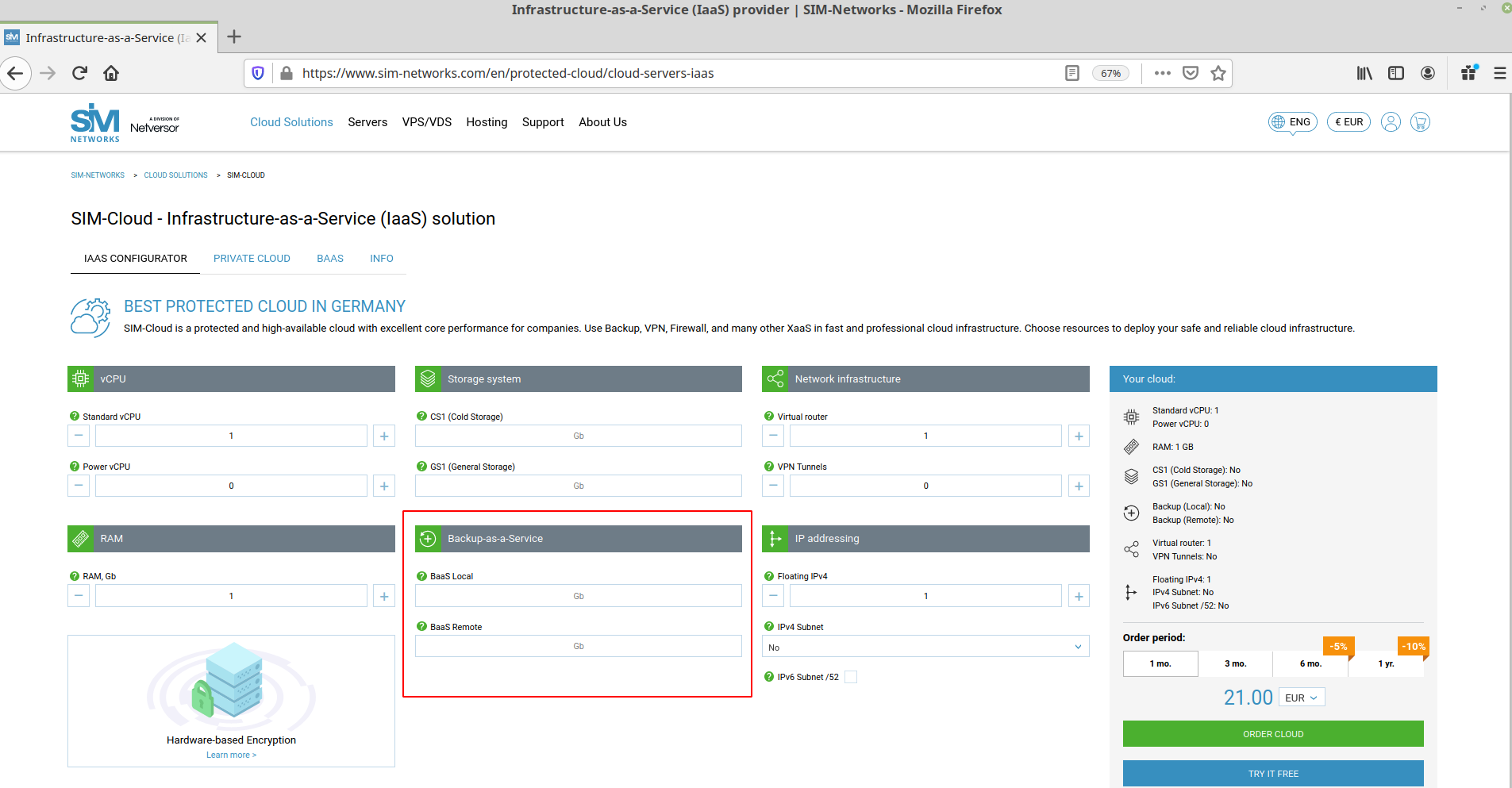 Заказать сервис облачного резервного копирования SIM-Cloud BaaS можно на странице Облачная инфраструктура как услуга (IaaS)):