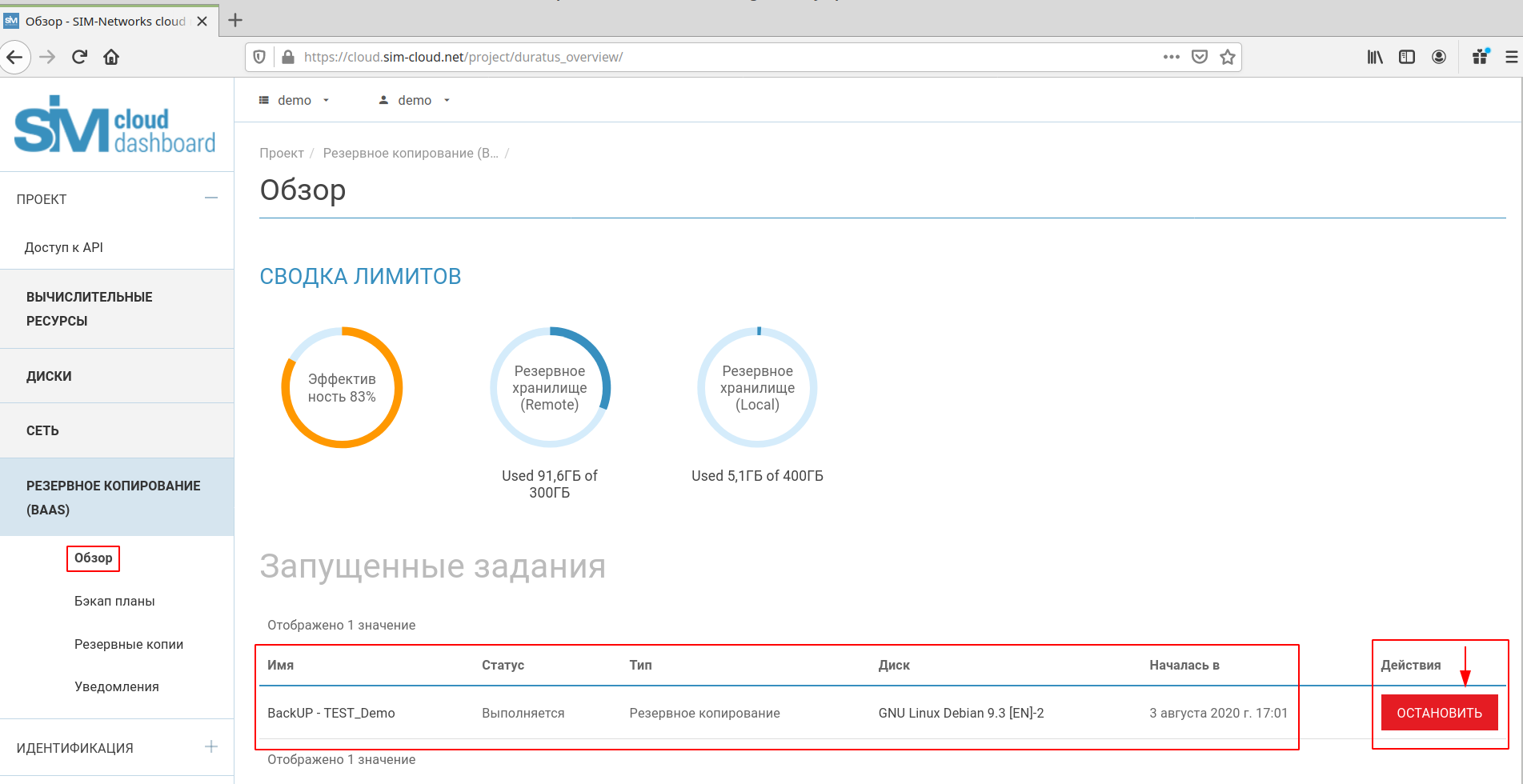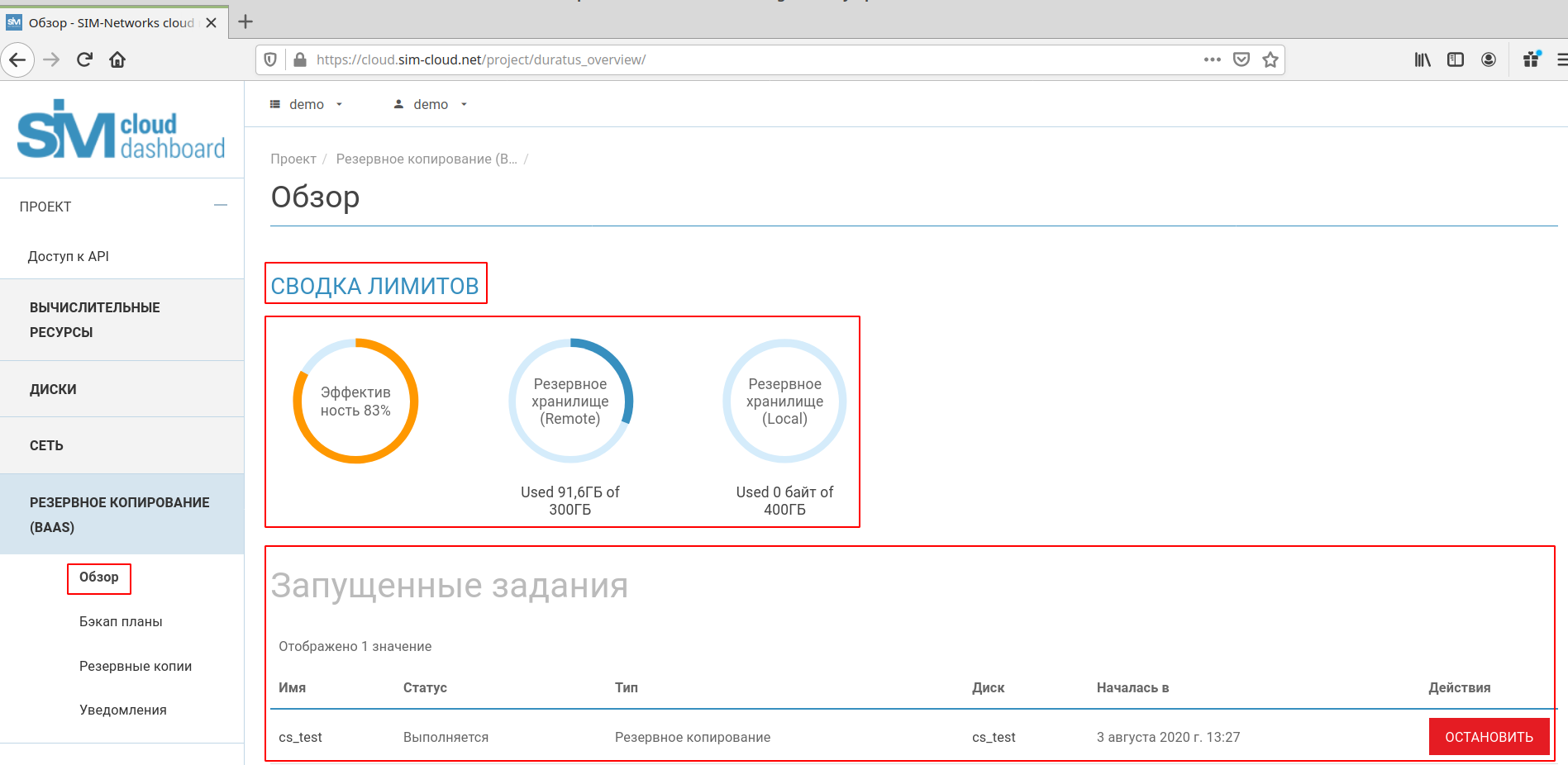 В разделе «Обзор» отображается сводка лимитов, а также эффективность использования дискового пространства резервного хранилища, отведенного клиенту под создание резервных копий. Для локального и удаленного хранилища указывается уже использованный дисковый объем и общий. Для лучшей визуализации данные представляются в виде круговой диаграммы с подписью (например: «Использовано 91,6 ГБ из 300 ГБ» для удаленного хранилища и «Использовано 0 байт из 400 ГБ» для локального хранилища). Эффективность использования ресурсов отображается в процентах (например: «Эффектив ность 83%»).