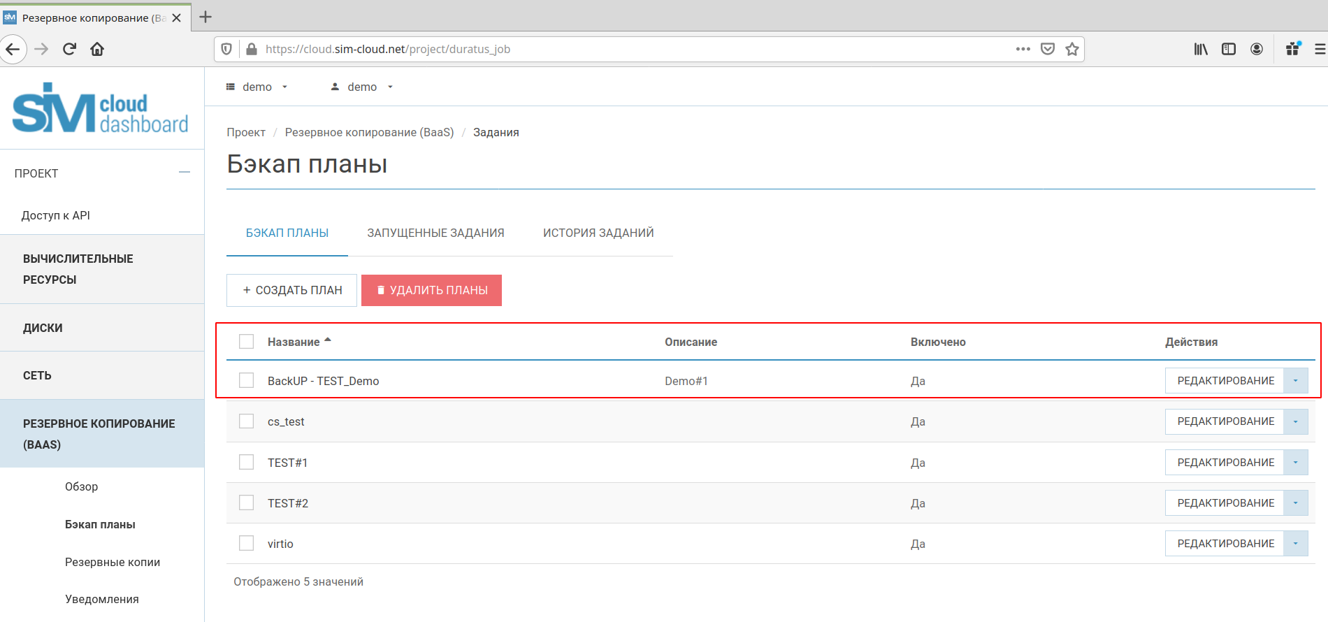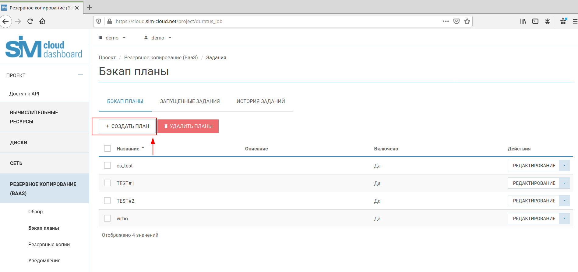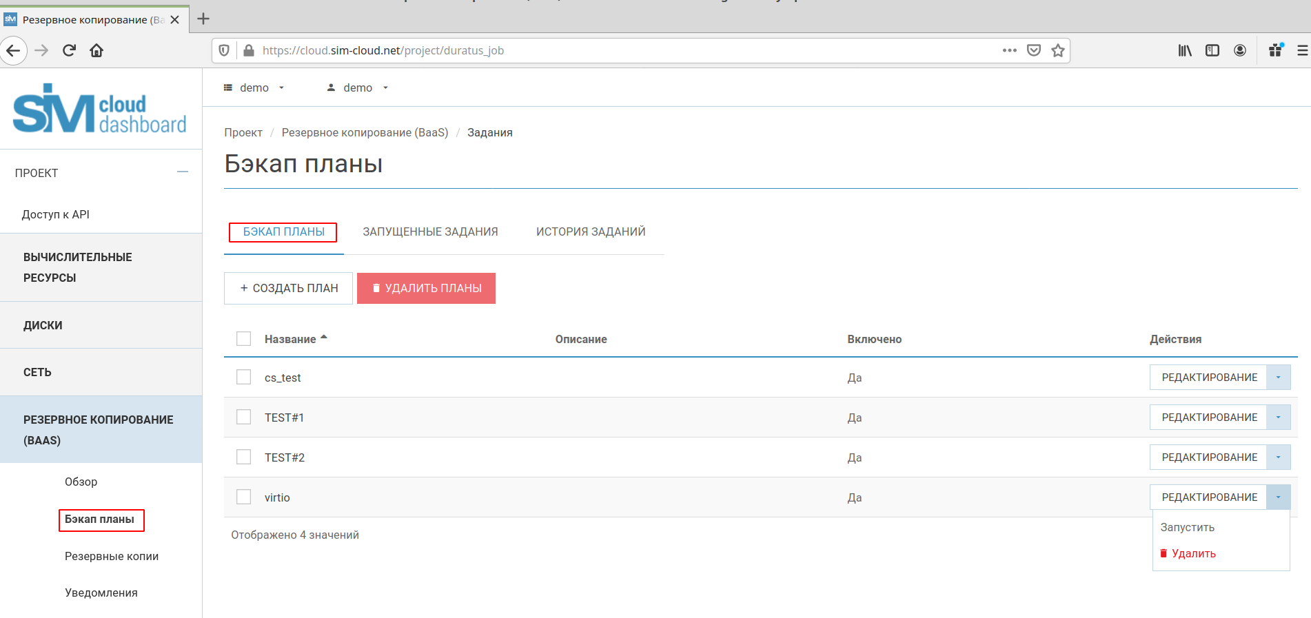 Раздел «Бэкап планы» является основным разделом сервиса, в котором выполняются основные действия по настройке резервного копирования. В данном разделе доступны следующие основные операции/функции с задачами: