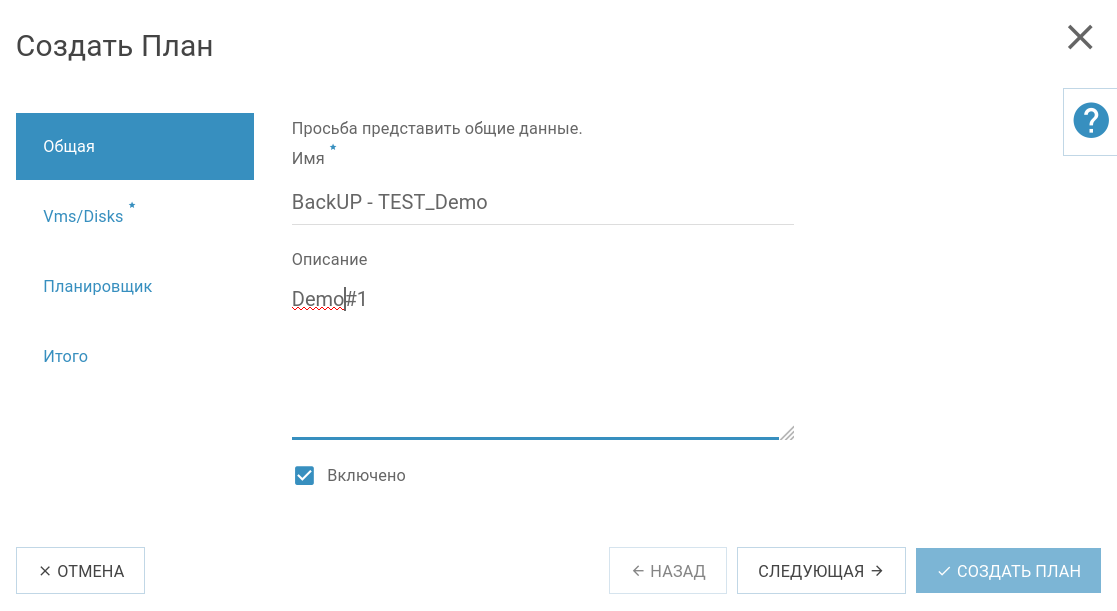 Для создания бэкап плана необходимо нажать кнопку «Создать план», после нажатия которой откроется окно мастера, где непосредственно и будут задаваться параметры и атрибуты нового бэкап плана: