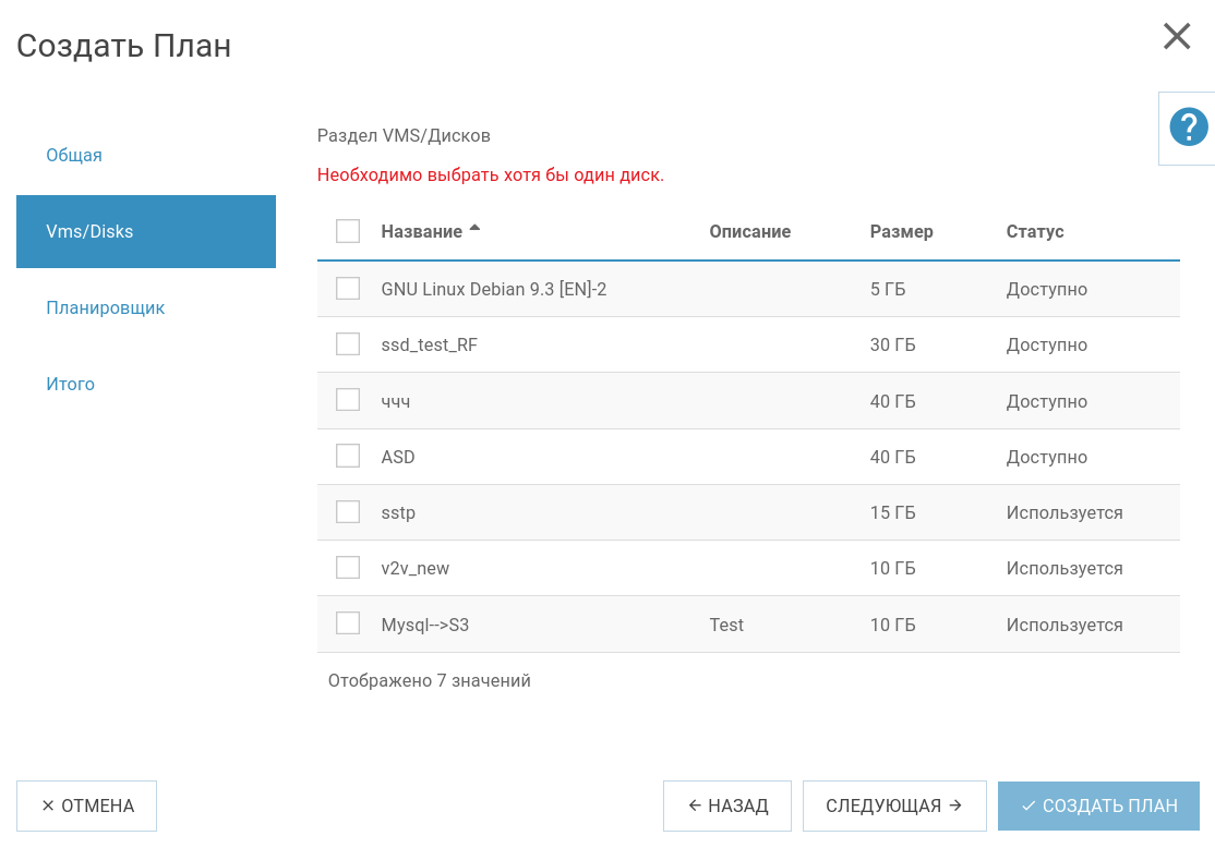 Также отсоединение диска происходит во время редактирования бэкап плана, когда пользовтаель сервиса снимает checkbox возле диска, для которого настраивался план резервного копирования.