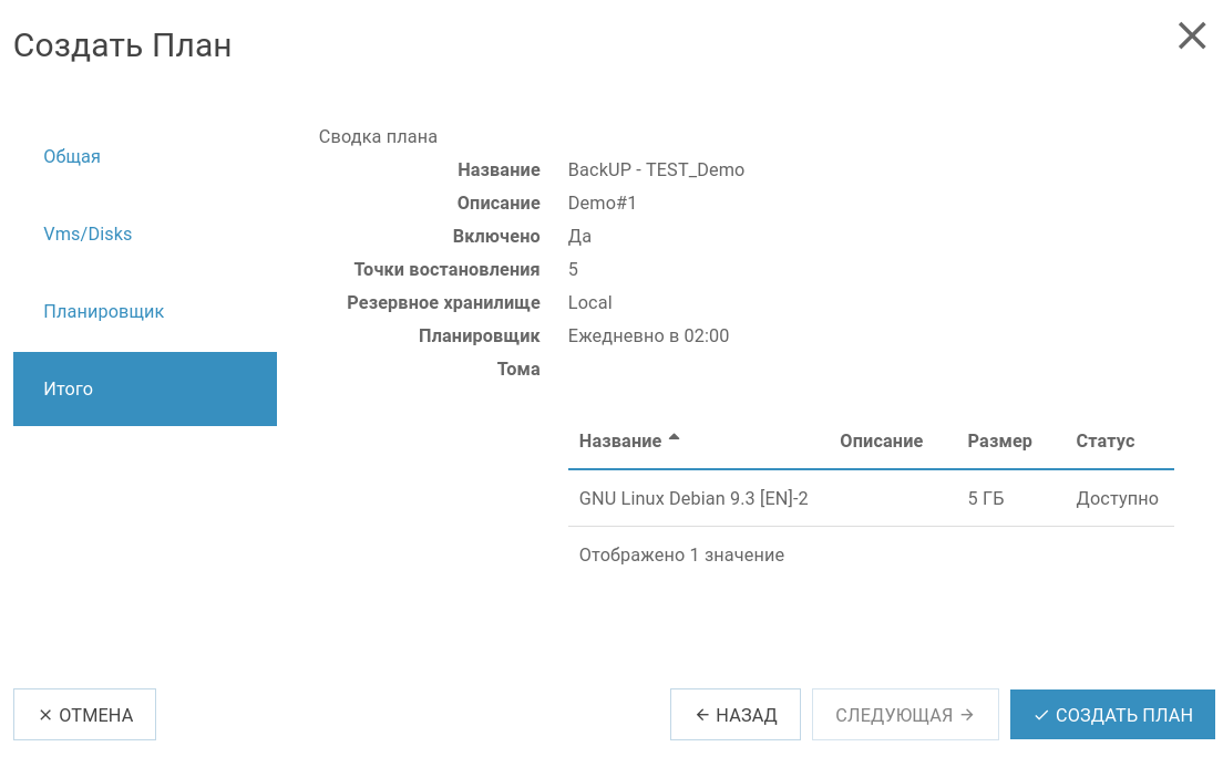 Для создания резервной копии тома необходимо создать бэкап-план, в который добавляются необходимые диски и настраивается планировщик, где указывается время создания резервных точек, количество точек восстановления, и указывается резервное хранилище, где будут храниться резервные копии диска.