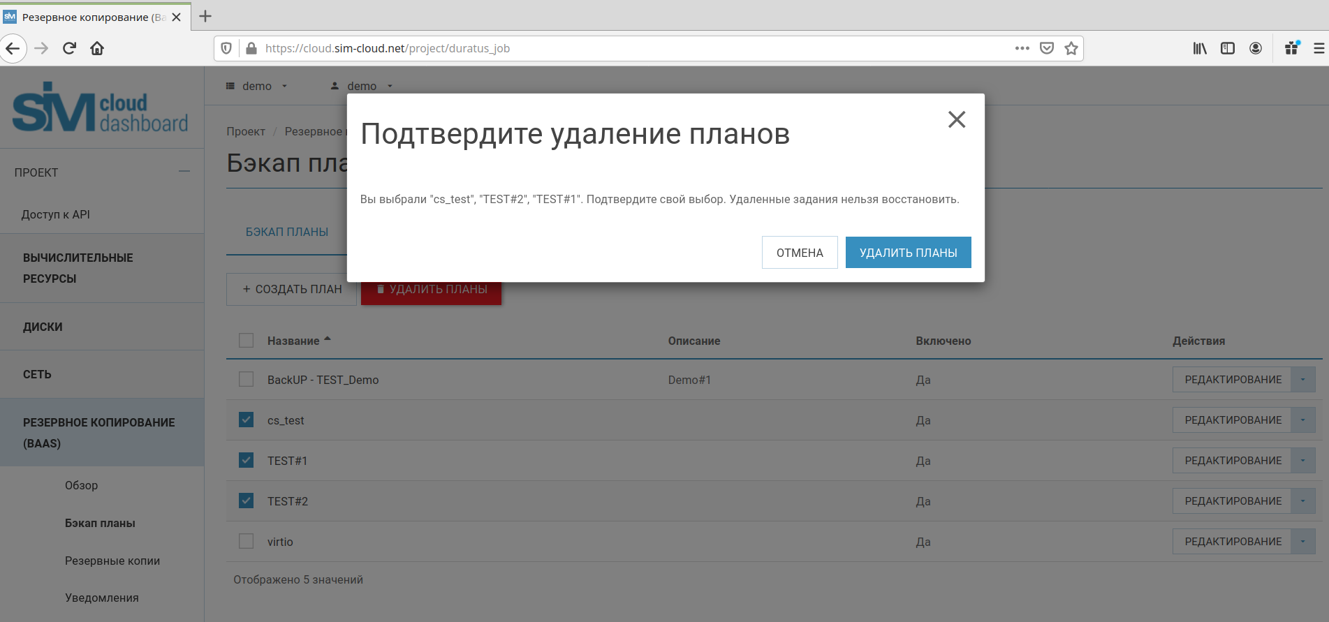 Для того, чтобы отредактировать бэкап план, необходимо выбрать пункт «Редактирование» в строке планов. После внесения всех необходимых изменений нужно нажать кнопку «Обновить план». В результате успешного завершения редактирования бэкап плана, сервис сгенерирует соответствующее сообщение: