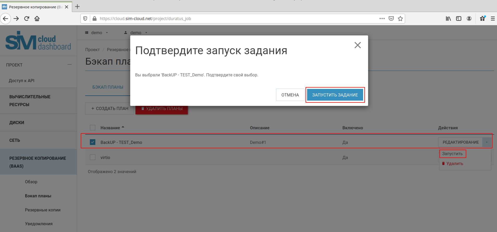 Все бэкап планы, имеющие значение «Да» в столбце «Включено», могут быть предварительно запущены в ручном режиме. Для запуска плана в ручном режиме необходимо выбрать пункт «Запустить» в выпадающем меню нужного бэкап плана. После нажатия кнопки «Запустить» сервис сгенерирует окно подтверждения выбранной операции, где будет отображен список наименований планов, которые будут запущены; для подтверждения нужно нажать кнопку «Запустить задание»: