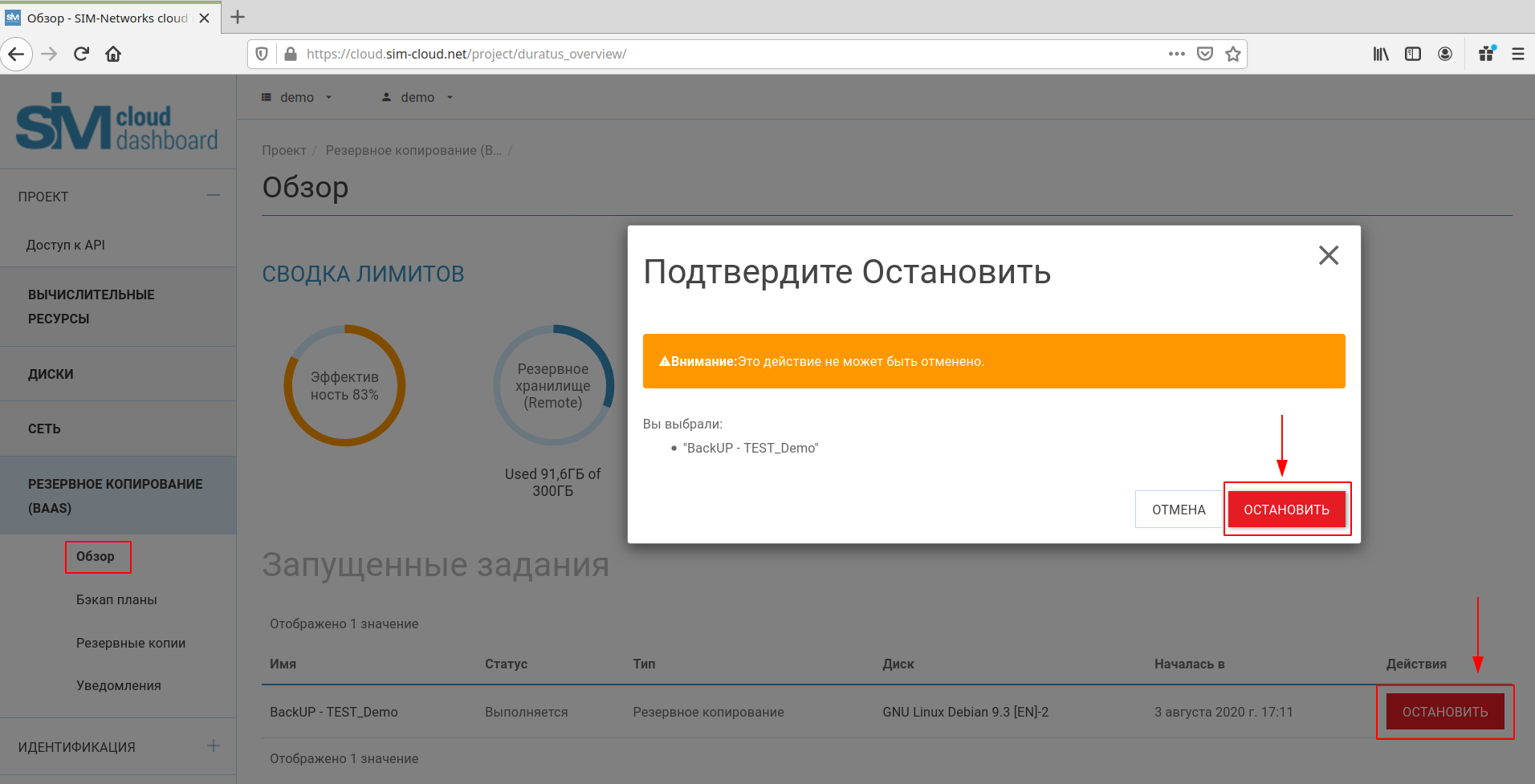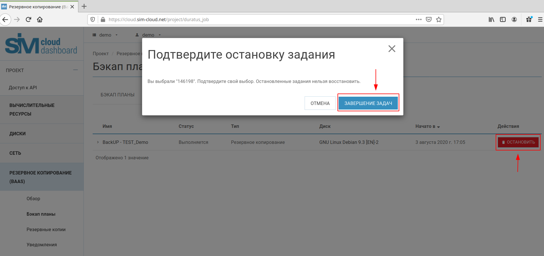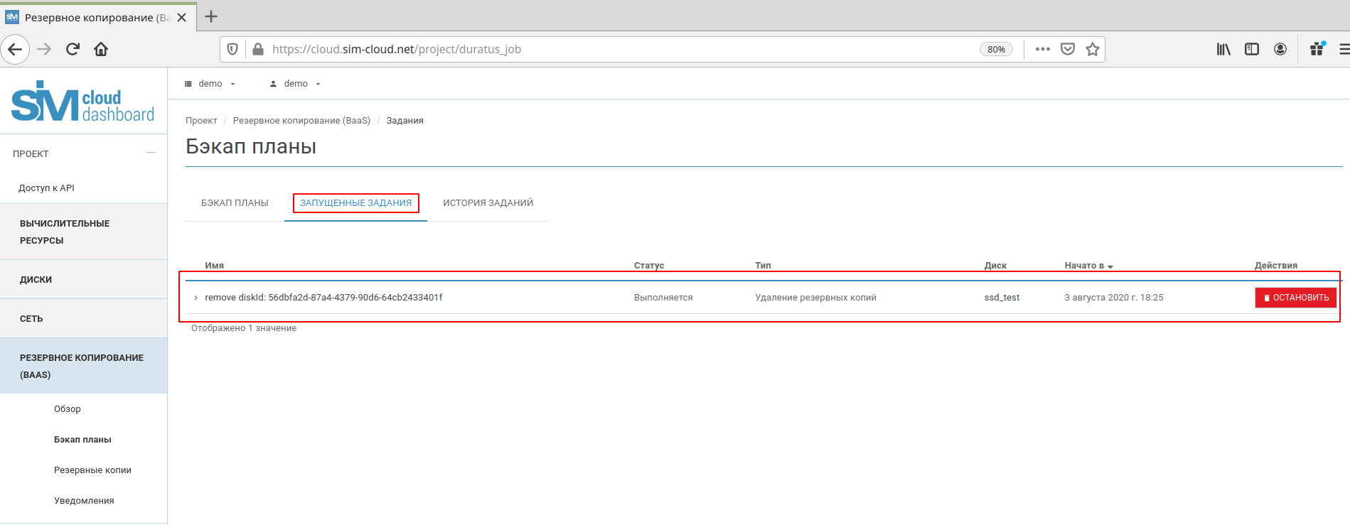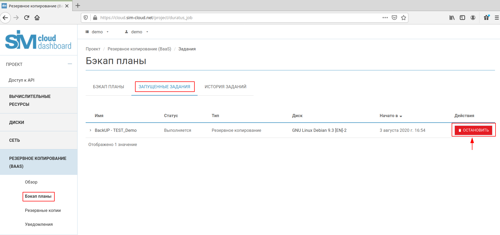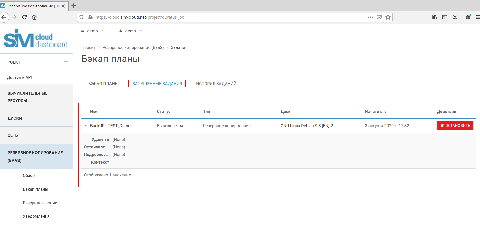 Аналогичные действия необходимо произвести при остановке бэкап плана в пункте «Запущенные задания» (раздел «Бэкап планы»):