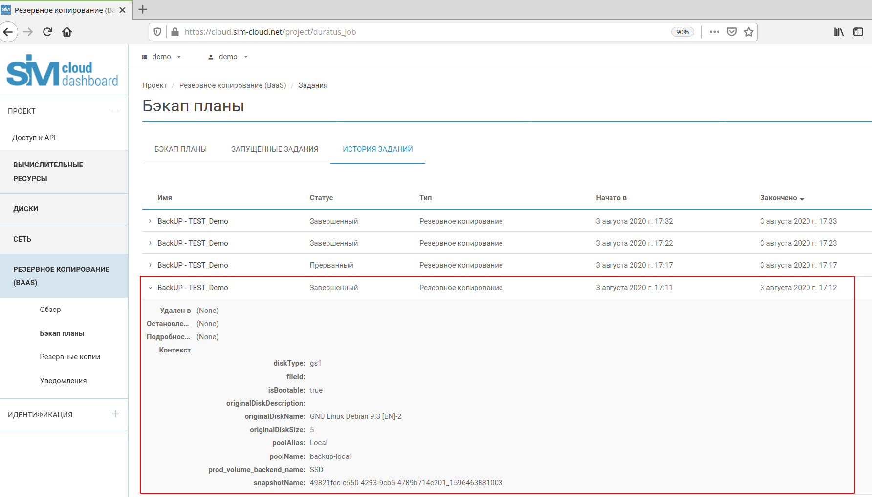 В процессе выполнения первого запуска бэкап плана, сервис BaaS создает полный бэкап диска (full snapshot).