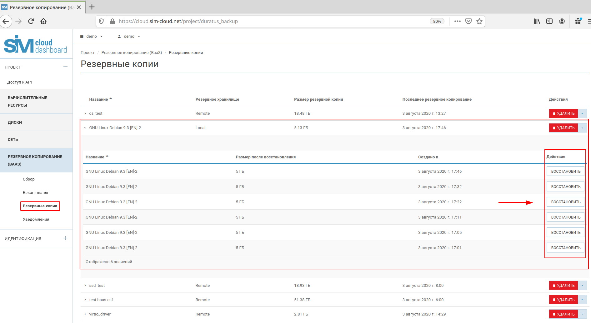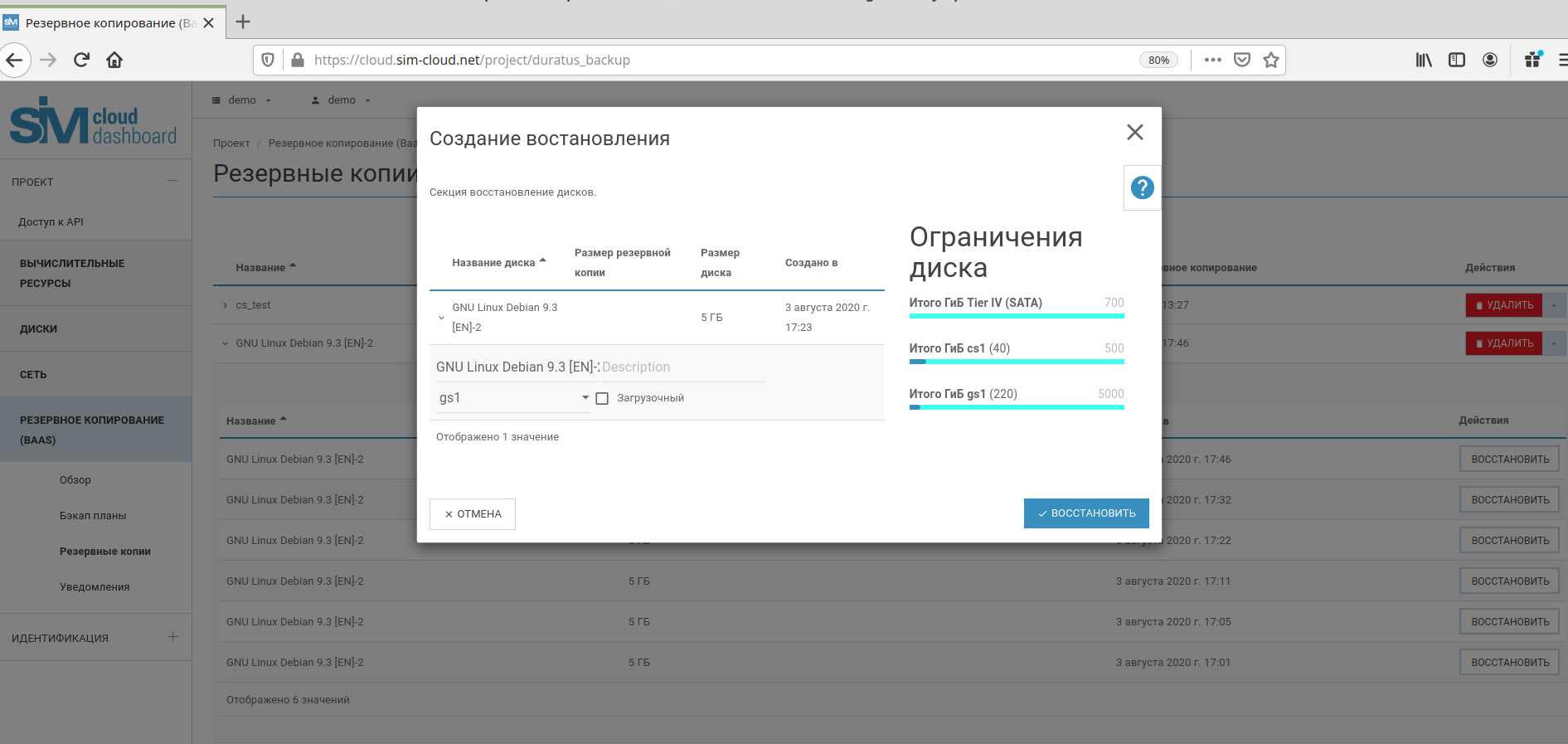В случае необходимости, SIM-Cloud BaaS позволяет оперативно восстановить данные тома и работу инстанса.