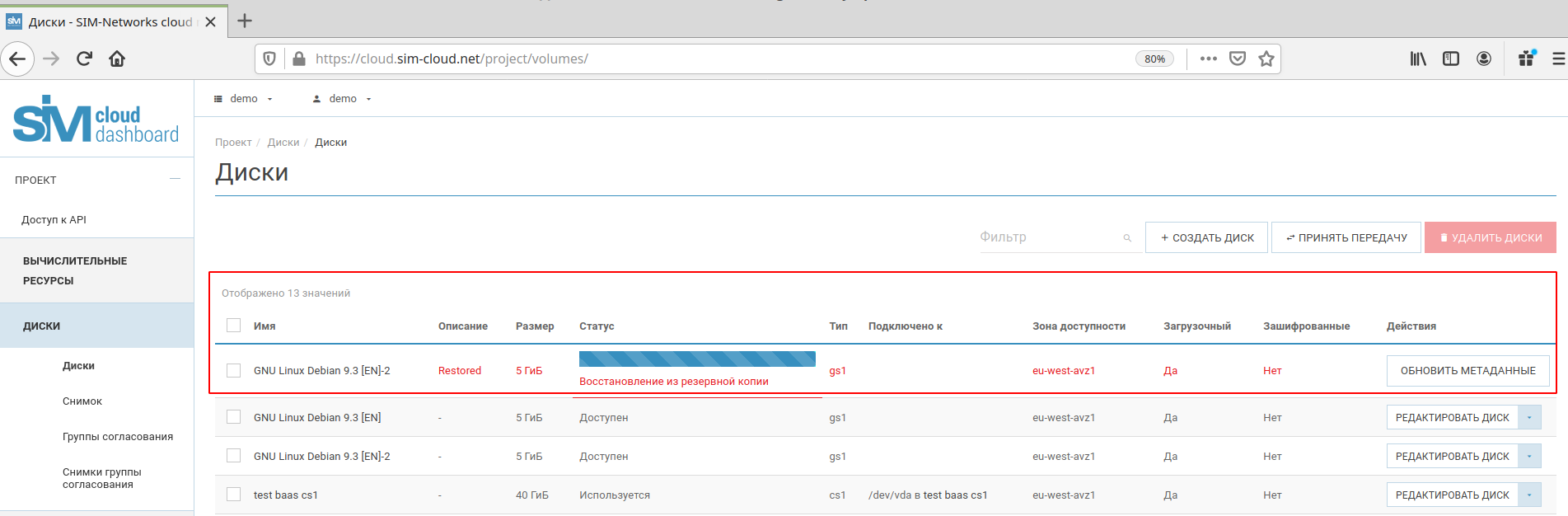 процесса, для чего нужно нажать кнопку «Восстановить». При этом запущенное активное задание будет отображаться в разделах «Задания» и «Обзор». После успешного завершения процесса по восстановлению в разделе «Диски» (секция «Вычислительные мощности») появится новый диск с указанными ранее атрибутами: