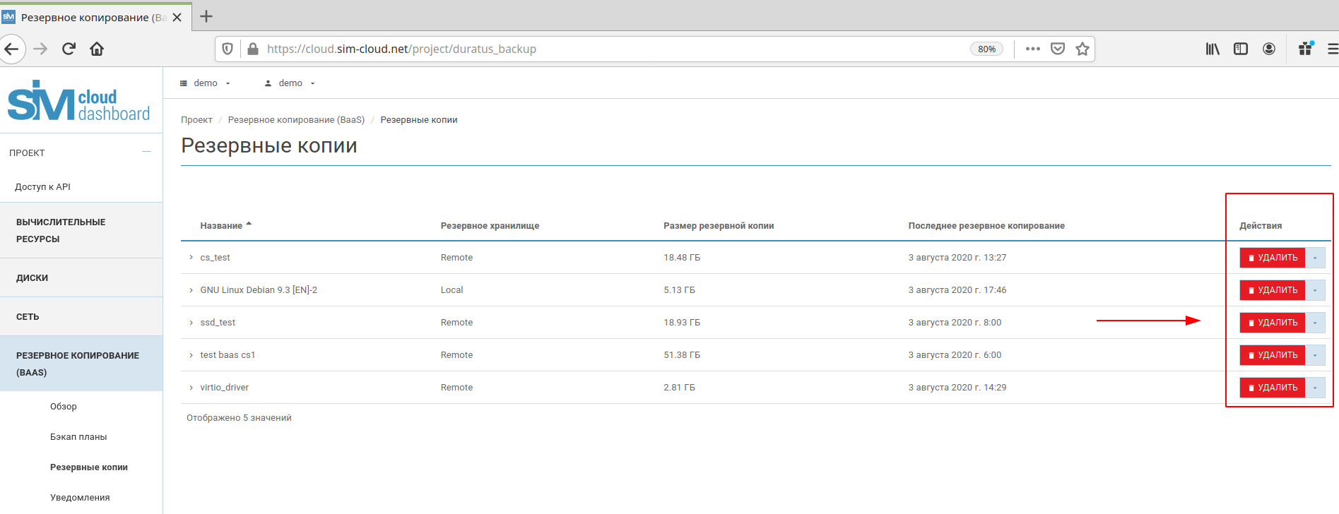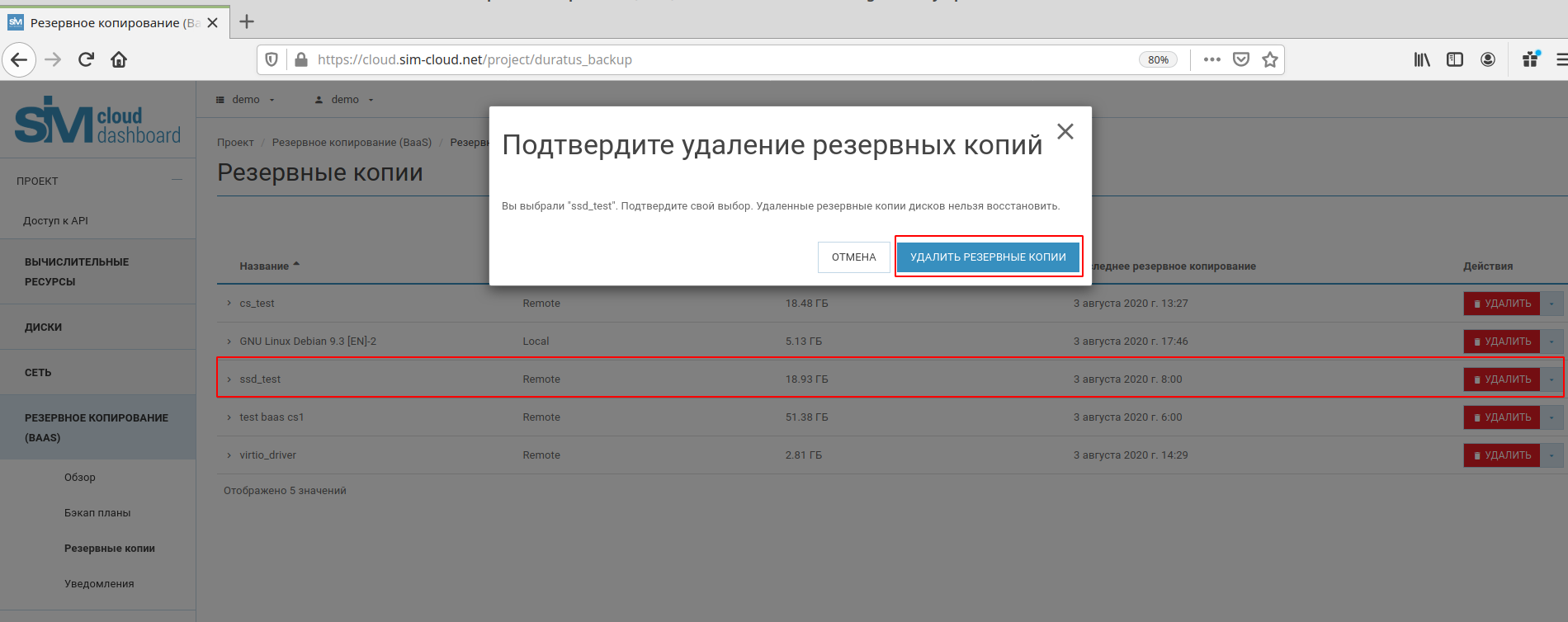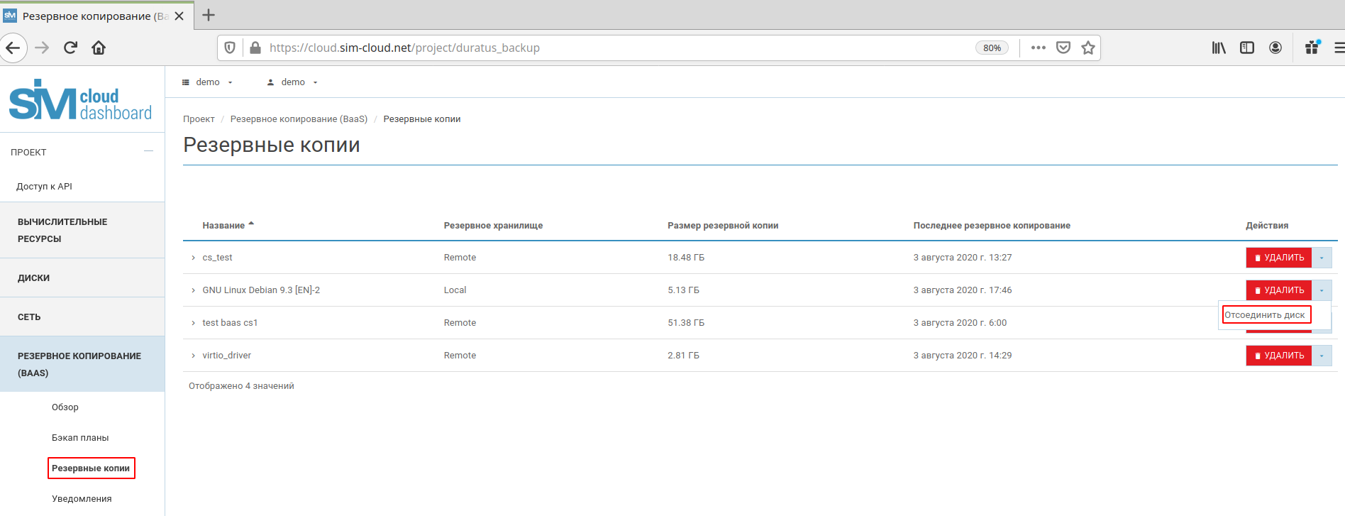 В разделе «Резервные копии» можно также выполнять действия по удалению резервной копии диска и по отсоединению диска.