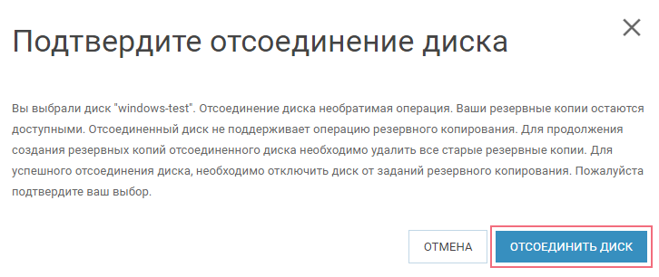 Отсоединение диска – необратимая операция. Ваши резервные копии остаются доступными. Отсоединенный диск не поддерживает операцию резервного копирования. Для продолжения создания резервных копий отсоединенного диска необходимо удалить все старые резервные копии. Для успешного отсоединения диска необходимо отключить диск от заданий резервного копирования.